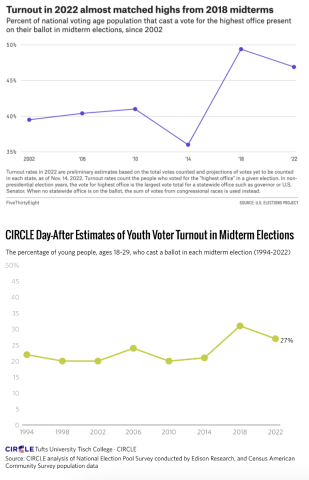 And it wasn’t just the candidates that were on the ballot, but key issues—whether explicitly or implicitly. All this led to high voter turnout across the board. Likewise, youth (18–29) turnout was 27 percent—second only for midterms in the last three decades to 2018.
